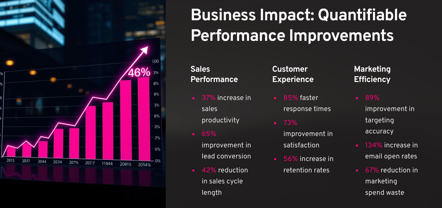 The results speak for themselves. Businesses implementing AI-powered CRM and BI dashboards consistently see dramatic improvements across key metrics: