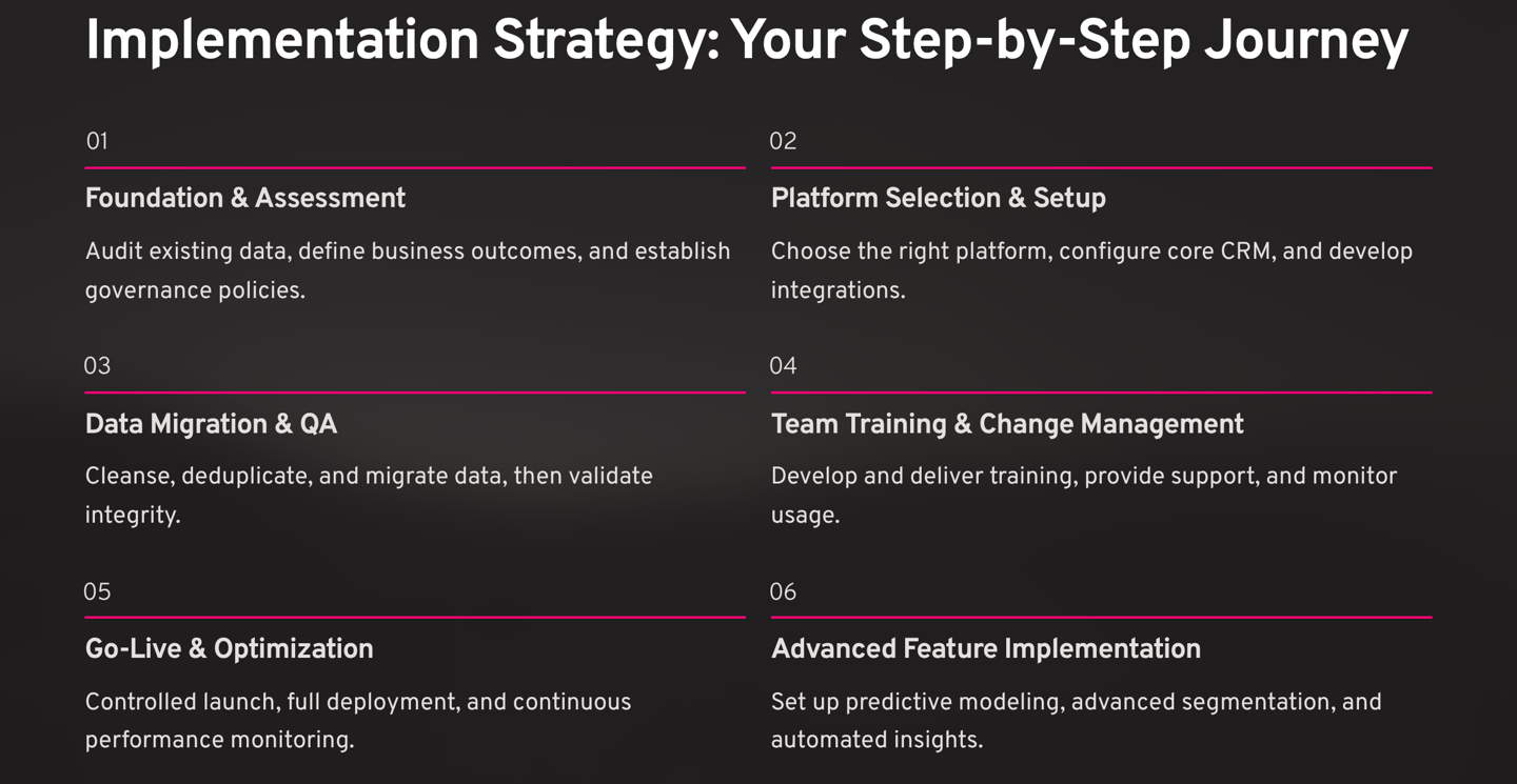 Executive Commitment and Vision The most successful implementations have visible, committed executive sponsors who understand that customer intelligence transformation is a strategic initiative, not just a technology project. These leaders communicate clear vision, provide necessary resources, and maintain focus on long-term value creation rather than short-term cost considerations.