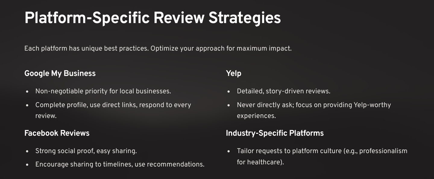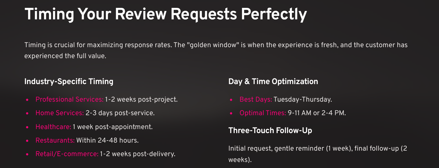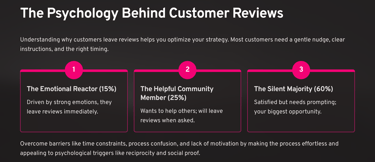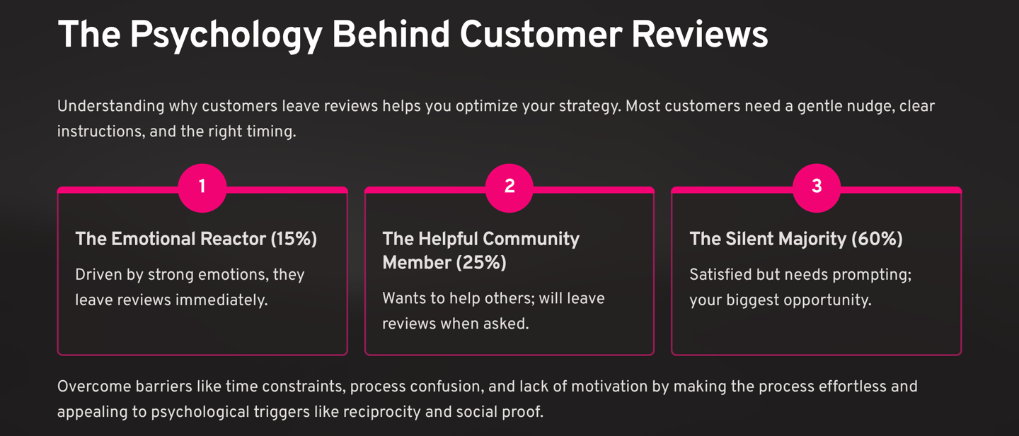 Reciprocity: When you've provided exceptional value, customers feel compelled to "give back" Social Proof: When they see others leaving reviews, it normalizes the behavior Personal Connection: When they feel genuinely appreciated as individuals Community Impact: When they understand their review helps others in their situation Ease and Convenience: When the process is effortless and takes less than 60 seconds