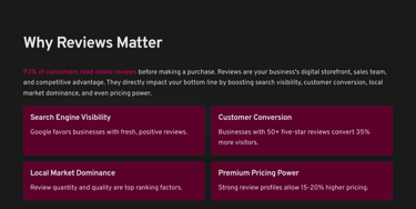 4. Premium Pricing Power: Businesses with strong review profiles can charge 15-20% more than competitors because customers associate positive reviews with higher quality and reliability.