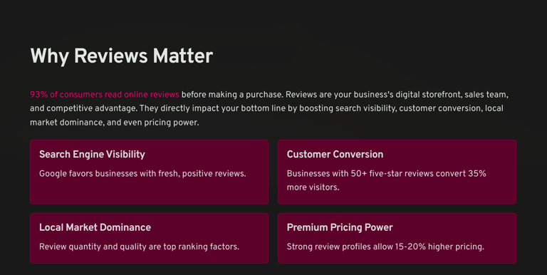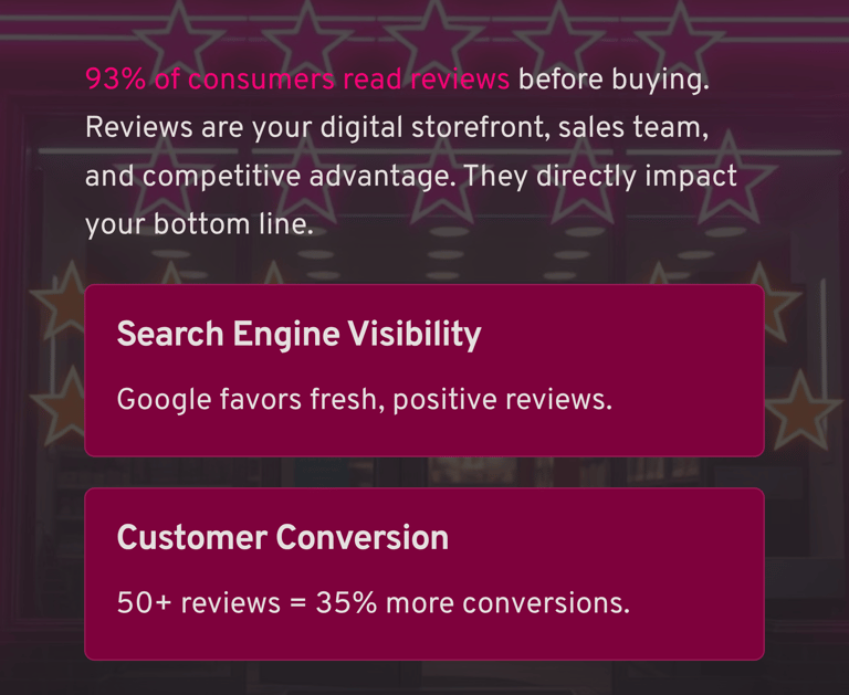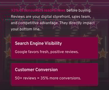 Reviews aren't just testimonials—they're your business's digital storefront, your sales team working 24/7, and your competitive advantage all rolled into one. Here's what most business owners don't realize: